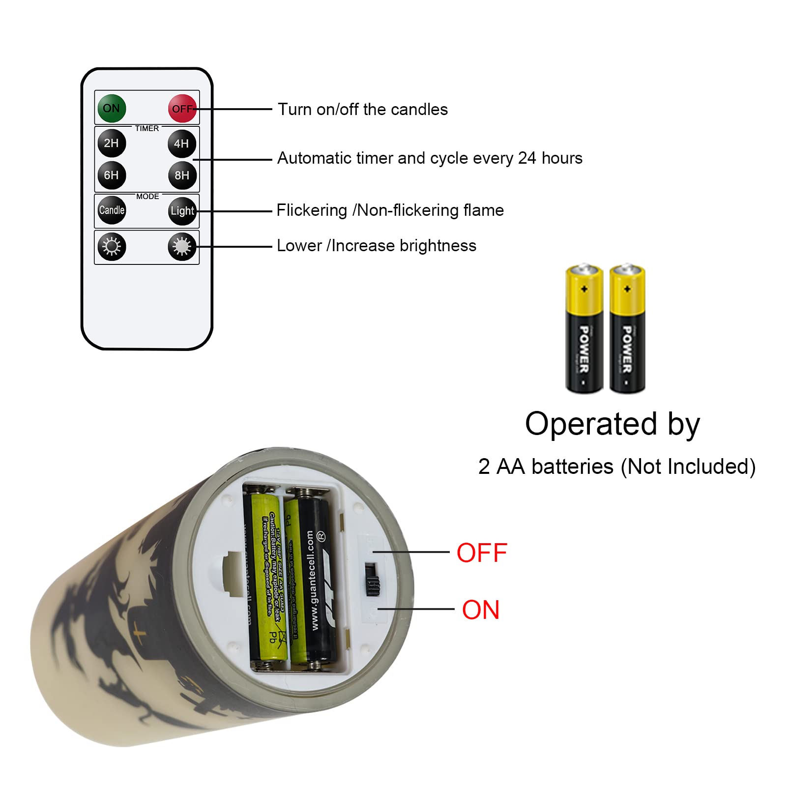 Each candle features a slide switch with ON/OFF/TIMER settings. When set to timer mode, the candle will automatically stay on for 6 hours and turn off for 18 hours, repeating this cycle daily. It's a hassle-free way to enjoy festive lighting without manually turning them on and off.